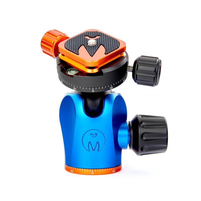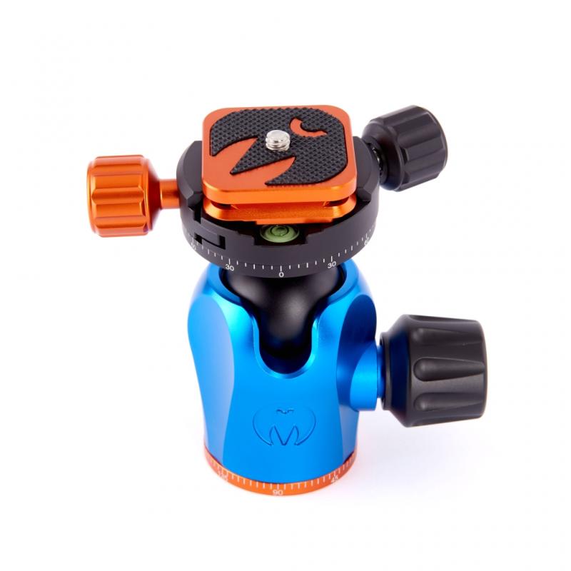 Hliníková kulová hlava s Arca kompatibilní rychloupínací destičkou a panoramatickou destičkou, umožňující otáčení o 360 stupňů, barva modrá