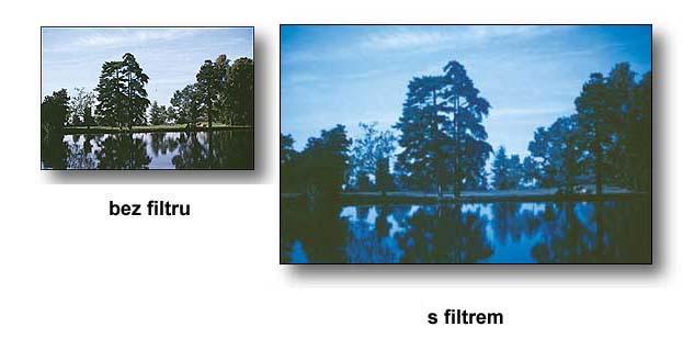 Konverzní modrá: Odstraňuje nebo zeslabuje silné oranžové tóny v umělém osvětlení Tungsten a nastavuje denní světlo při použití filmů pro denní světlo. Tento filtr převádí barevnost zdroje umělého světla (wolfram) na denní světlo. Filtr dodává zejména zimním krajinám „studený“ efekt přidáním namodralého tónu - odstínu.