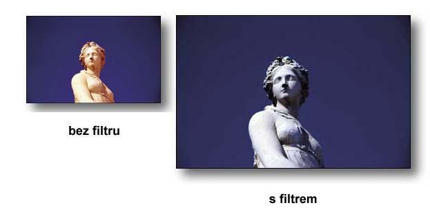 Konverzní modrá: Odstraňuje nebo zeslabuje silné oranžové tóny v umělém osvětlení Tungsten a nastavuje denní světlo při použití filmů pro denní světlo. Tento filtr převádí barevnost zdroje umělého světla (wolfram) na denní světlo. Filtr dodává zejména zimním krajinám „studený“ efekt přidáním namodralého tónu - odstínu.