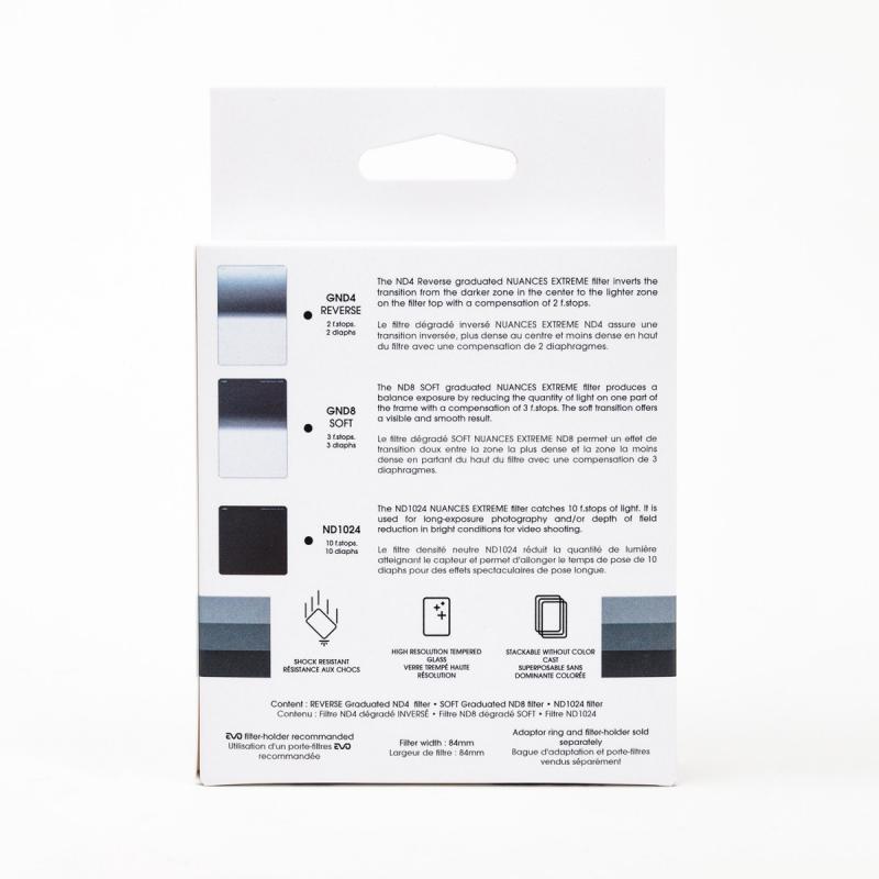 Nuances Extreme Soft Grade ND8 umožňuje až 3 clonové hodnoty kompenzace světla s měkkým přechodem z horní části filtru. Nuances Extreme ND1024 zachytí 10 clonové hodnoty, přičemž jeho použití bude věnováno fotografování s dlouhou expozicí a / nebo redukci hloubky ostrosti v extrémně jasných podmínkách pro natáčení videa. Zaoblené rohy a tloušťka 2 mm usnadňují vkládání filtrů Nuances Extreme v extrémních podmínkách. Společnost COKIN doporučuje použít držák filtru EVO k zajištění účinné ochrany proti průniku světla.