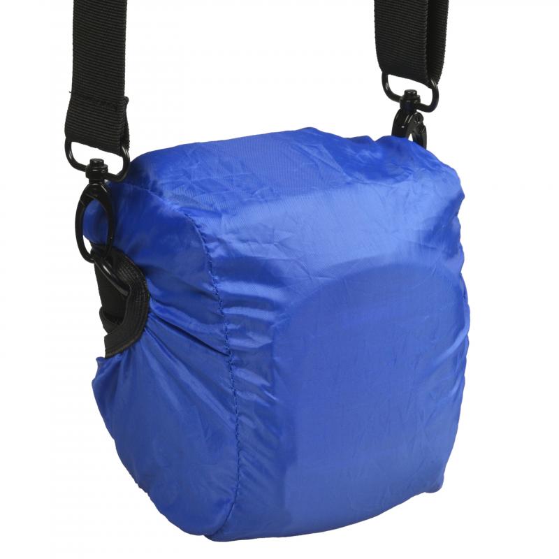 Modrý dešťový obal je nerozebíratelně uložen na zadní straně sáčku a lze jej podle potřeby rychle přesunout z vaku nahoru.