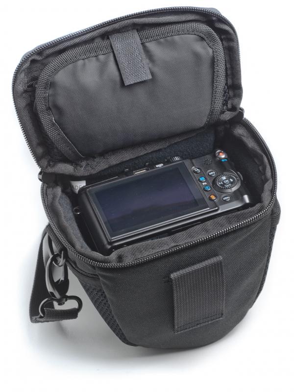 Taška umožňuje rychlý přístup k fotoaparátu, protože víko se otevírá pryč od těla a zajišťuje se v otevřené poloze.