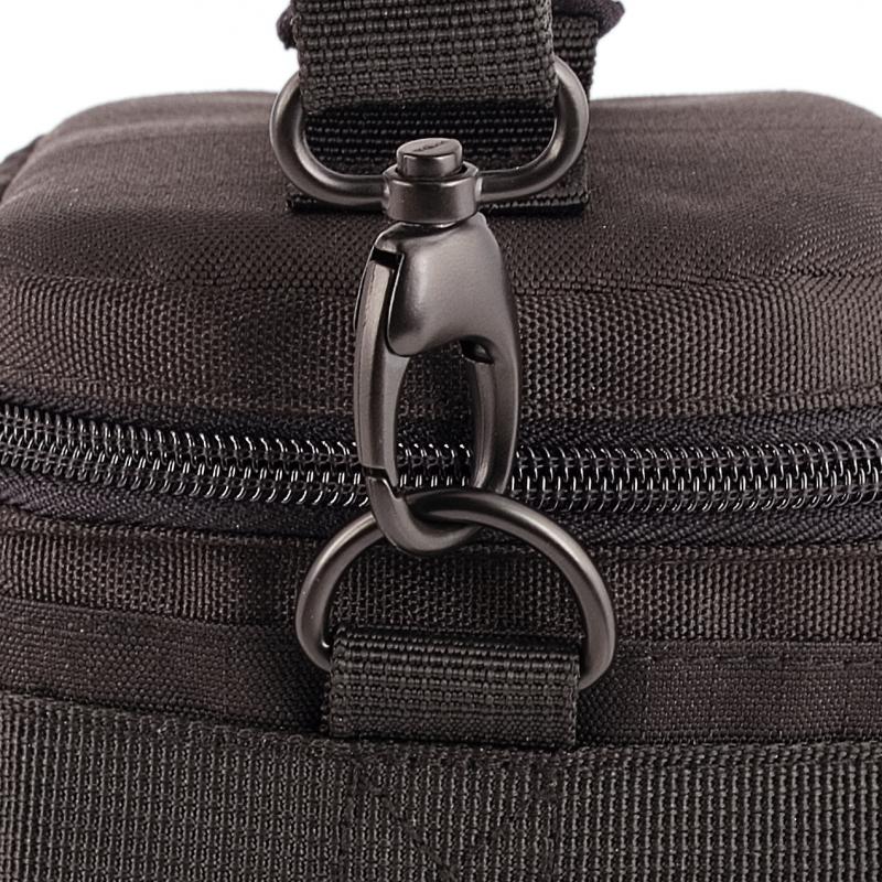 S kapsami na vnitřní straně vnějšího víka i na obou stranách. Vnější obal se zipem. Střední víko s přihrádkami na příslušenství, které lze připojit suchým zipem k vnějšímu víku. Prostorná přední kapsa s přihrádkami na organizér se zipem.