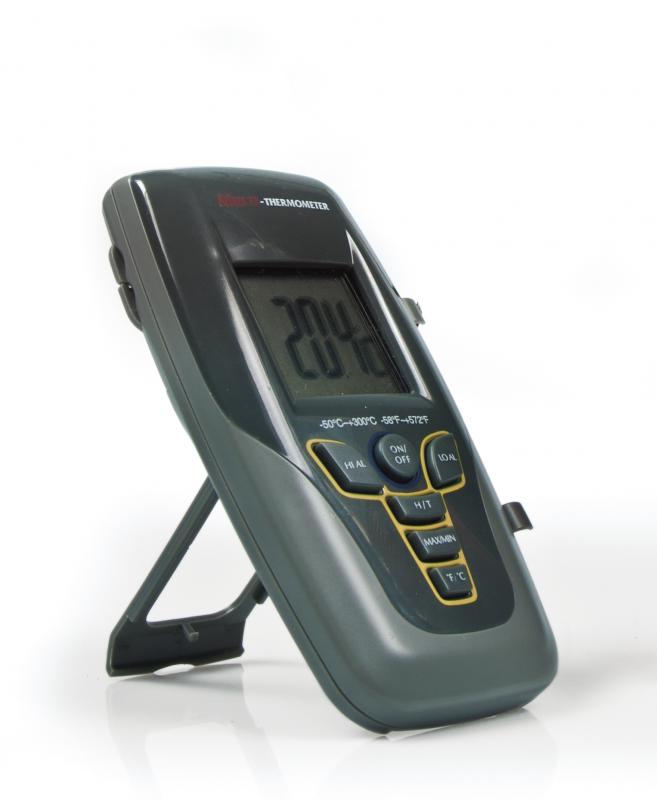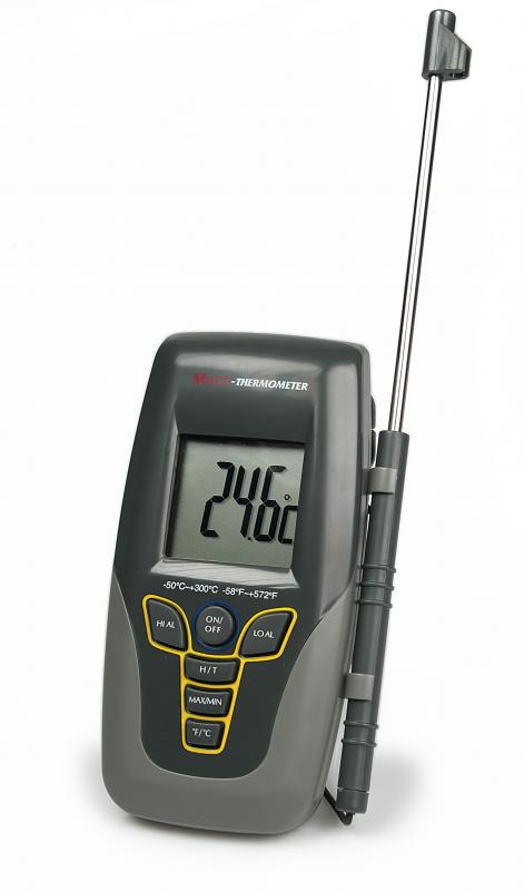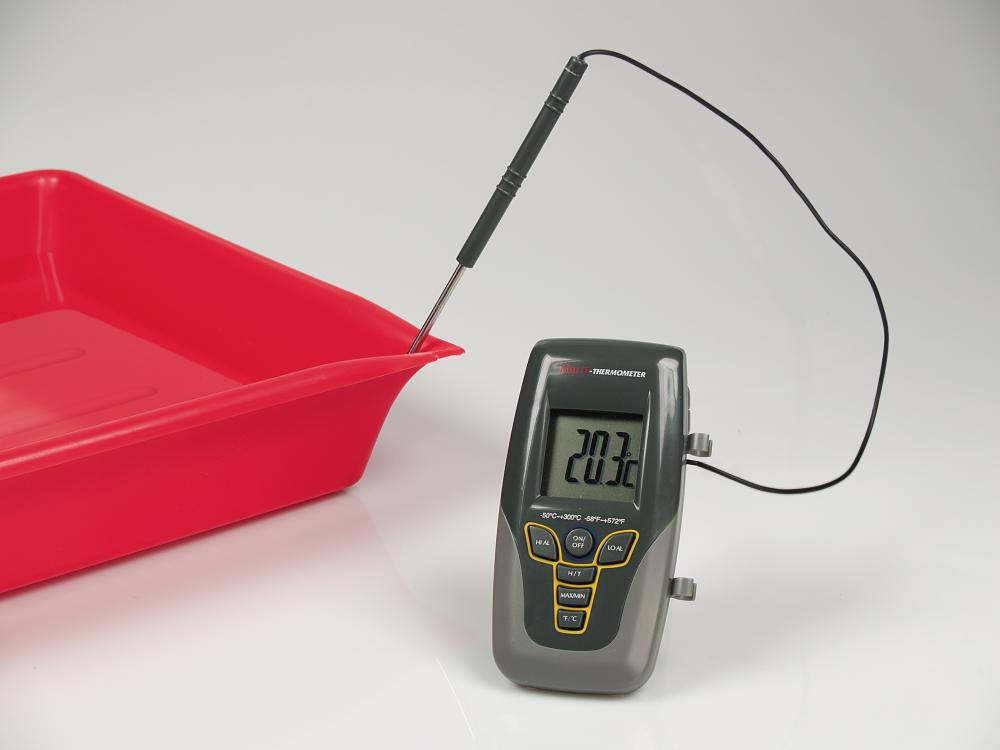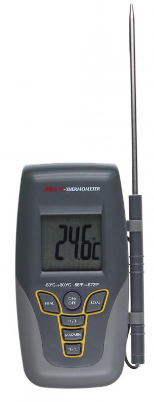 Víceúčelový teploměr přepínatelný z ° C na ° F. Rychlé měření, krátká reakční doba. Okruh MIN / MAX pro zobrazení nejnižší nebo nejvyšší naměřené teploty. Nastavitelná minimální a maximální teplota, pod nebo nad zvukovým signálem. Automatické vypnutí. Snímač teploty z nerezové oceli, s kabelem 1 m. Se sklopným nastavovacím raménkem.