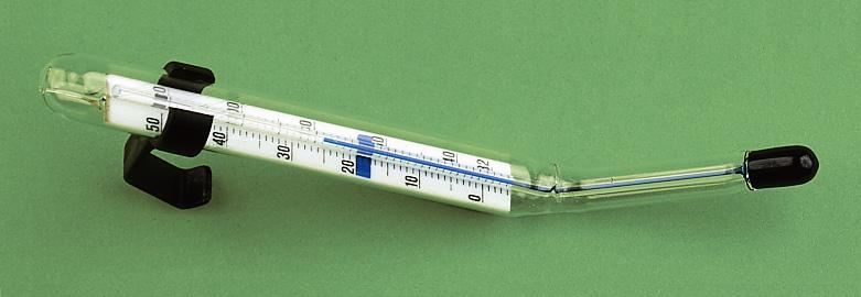 Úhlová verze teplotoměru s držákem pro zavěšení na okraj mísy. Alkoholová náplň.Stupnice Celsia a Fahrenheita 0 ... 50 ° C nebo 32 ... 120 ° F. Značení při 18 ° C (64 ° F).Délka: 85 mm + 40 mm délka nohy, průměr 10 mm
