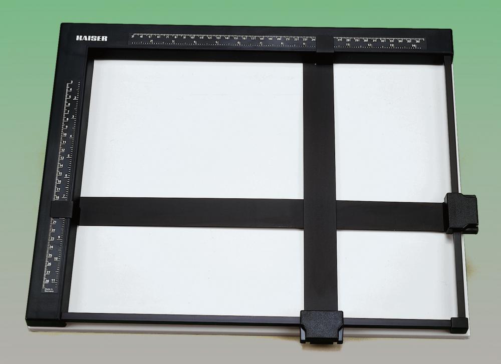 Kovová základní deska s protiskluzovou základnou a matným bílým povrchem.Nastavitelná zarážka papíru pro šířky okrajů 5 ... 12 mm.Kovový skládací rám se stupnicemi v cm a palcích a samostatné papírové upínací zařízení.Oboustranné samonastavovací maskovací pásky s tlačítky pro rychlou akci.Maximální dosažitelný formát 28 x 36 cm.