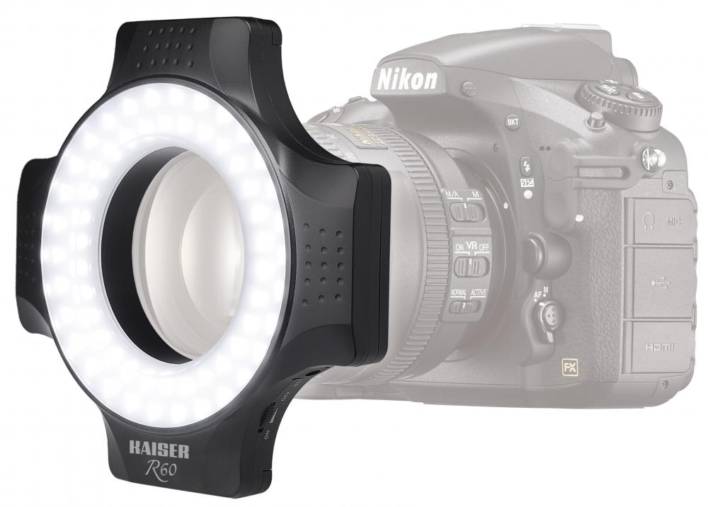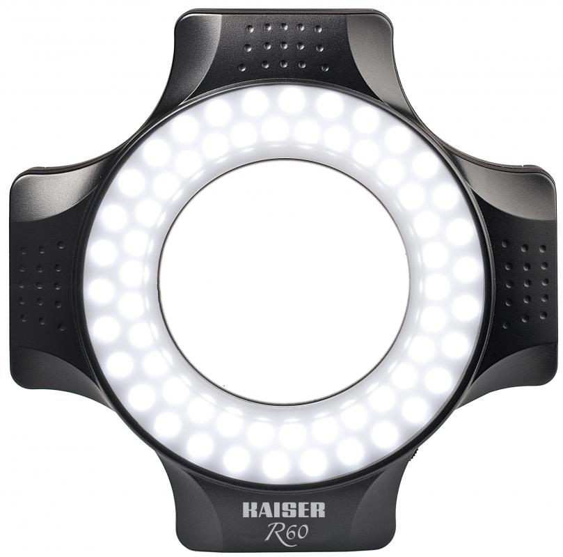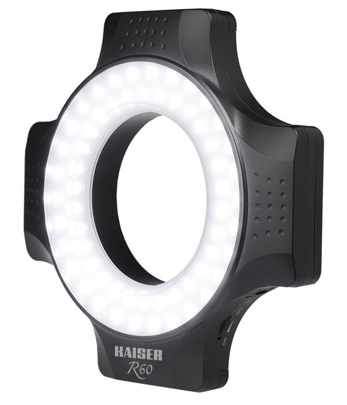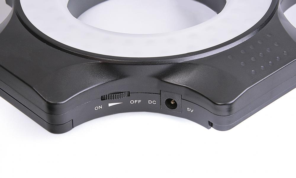 Výkonné LED kruhové světlo pro osvětlení bez stínu na blízko. 60 LED diod denního světla (barevná teplota cca 5600 K). Osvětlení přibližně 2300 luxů ve vzdálenosti 30 cm s úhlem paprsku 52 °. Nekonečně stmívatelné.
