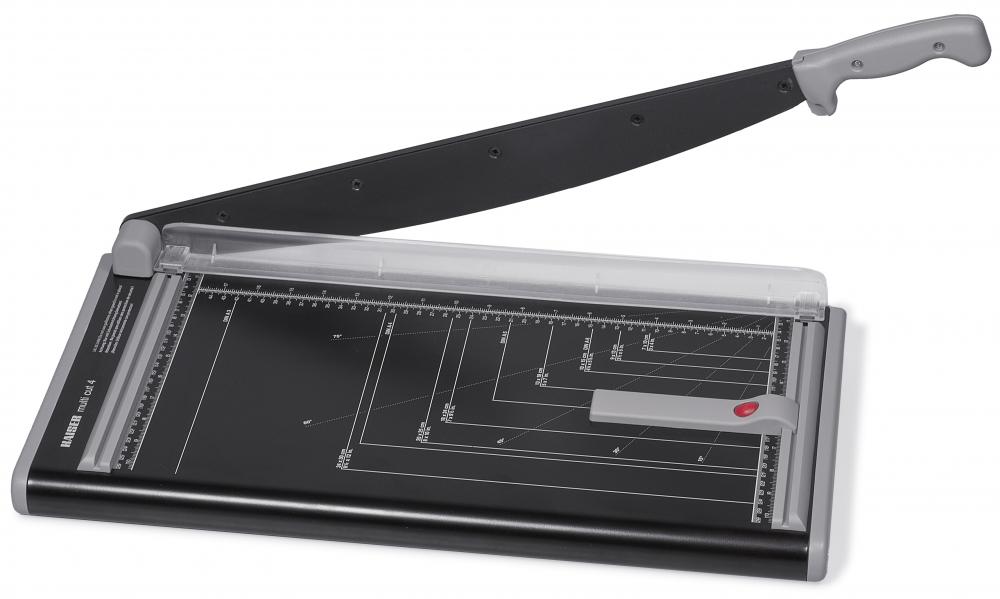 Bezpečná páková řezačka s broušeným horním a dolním nožem. Rukou přítlačné pravítko. Oboustranný úhlový systém pro pravoúhlé řezy v měřítku v cm a palcích. Odnímatelný magnetický doraz.