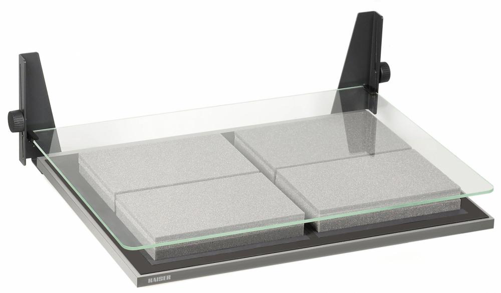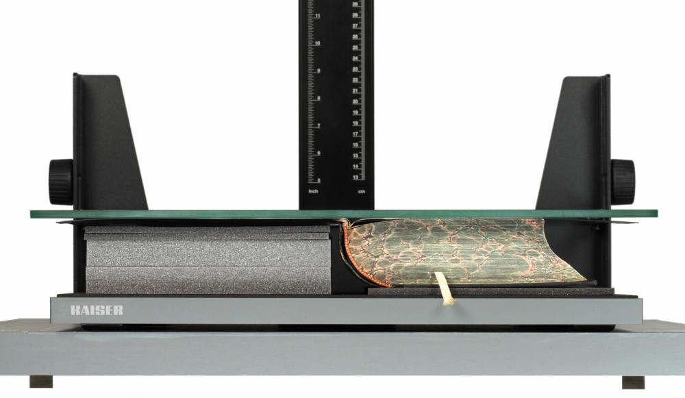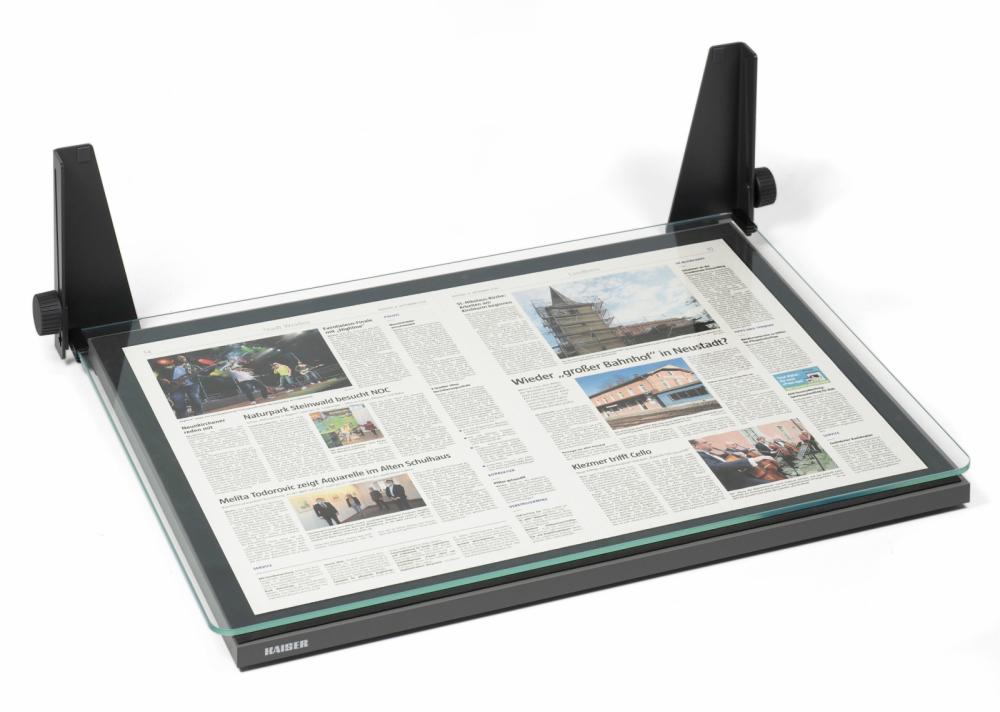 Přídržné zařízení se skleněnou antireflexní přítlačnou deskou pro přesné umístění při reprodukci z knih, časopisů a novin