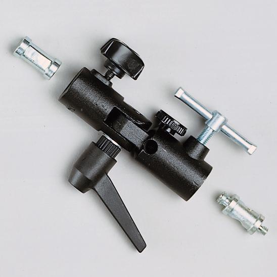 Silný kovový kloub pro upevnění světel na stativy.Otočná horní část a uzamykatelná v každé poloze as držákem pro reflexní deštník, ø cca 9,2 mm.