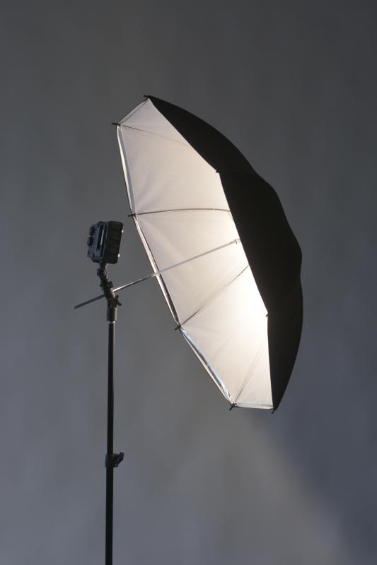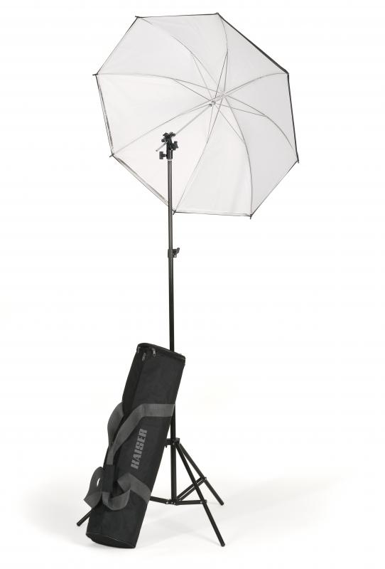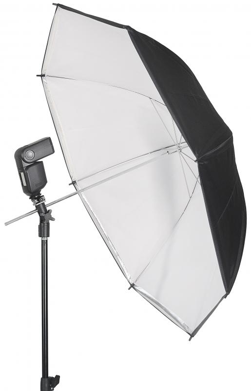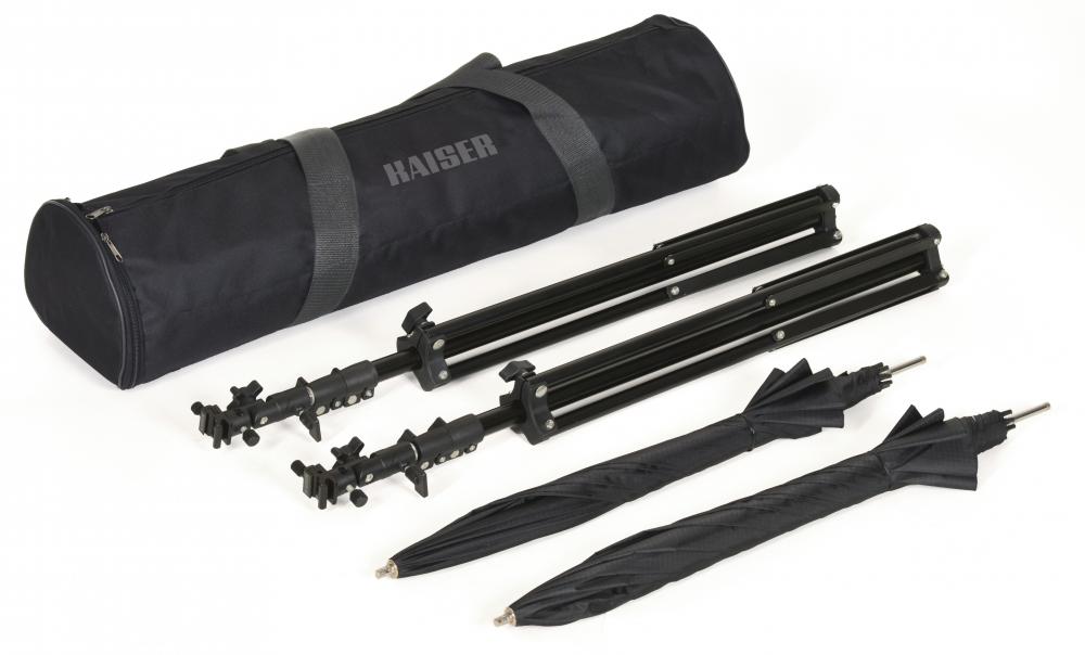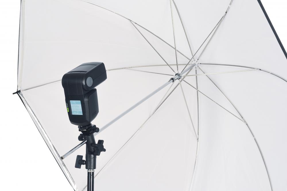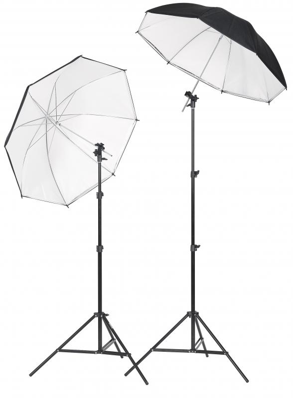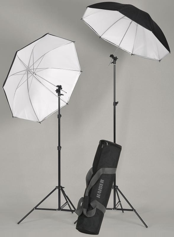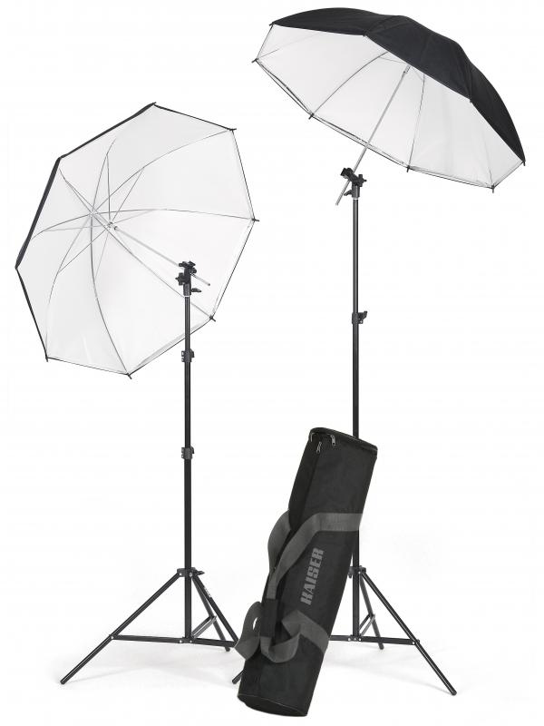 2 reflexní / průsvitné deštníky, ø 90 cm, uvnitř s bílým potahem tkaniny, vně s odnímatelným reflexním potahem a transportní
