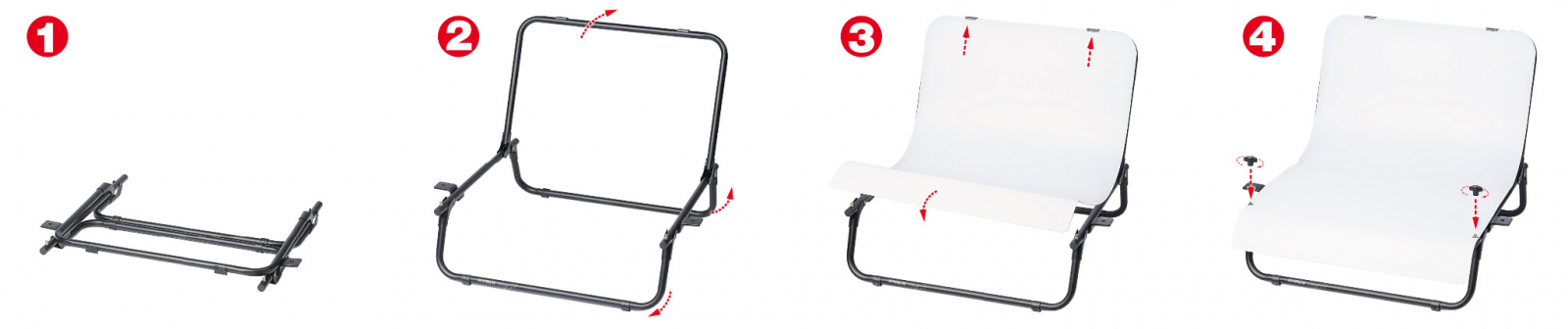 Kompaktní stůl pro fotografování malých předmětů bez rušivého pozadí. Skládá se ze skládací trubkové ocelové konstrukce a bílé, průsvitné plastové desky s předem vytvořenou kulatou přední hranou. Dvě kompaktní LED denní světla pro měkké a rovnoměrné osvětlení. S 96 vysokými LED diodami CRI v tenkém pouzdře. Včetně kloubového ramene se 3 uzamykacími klouby a variabilní základnou. Panel 14 x 20 cm s diskem difuzoru.