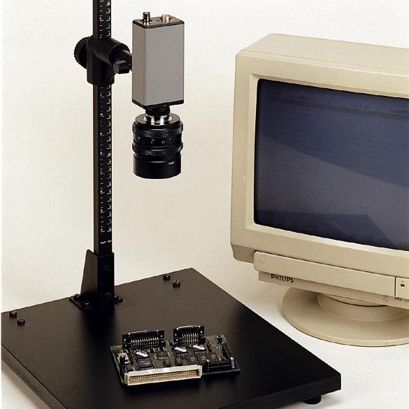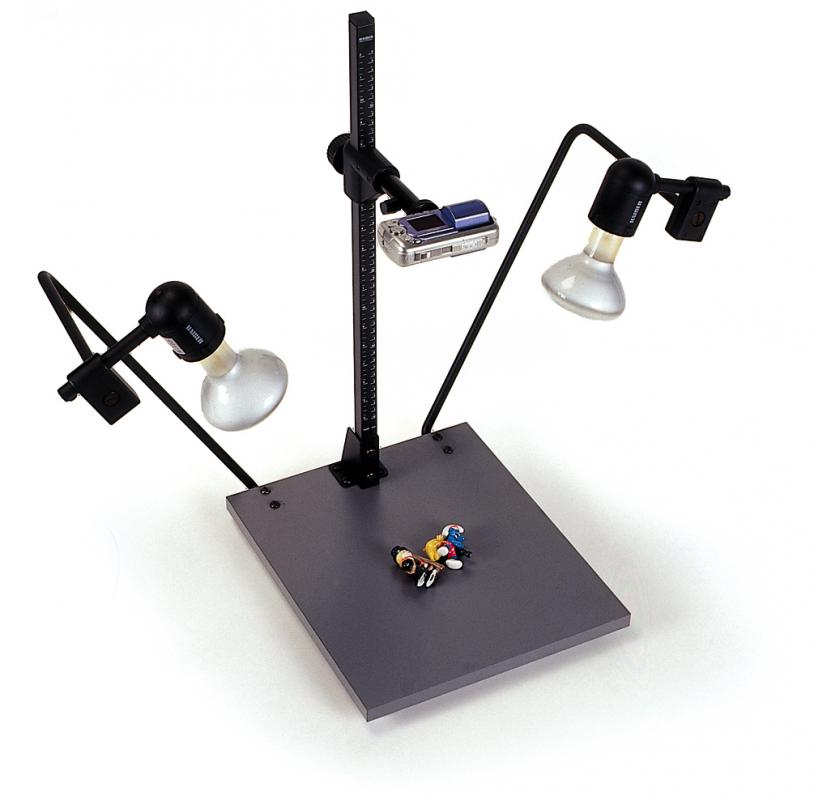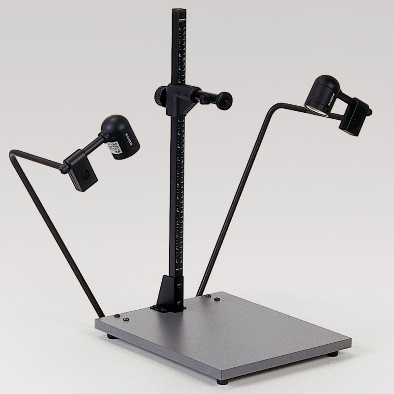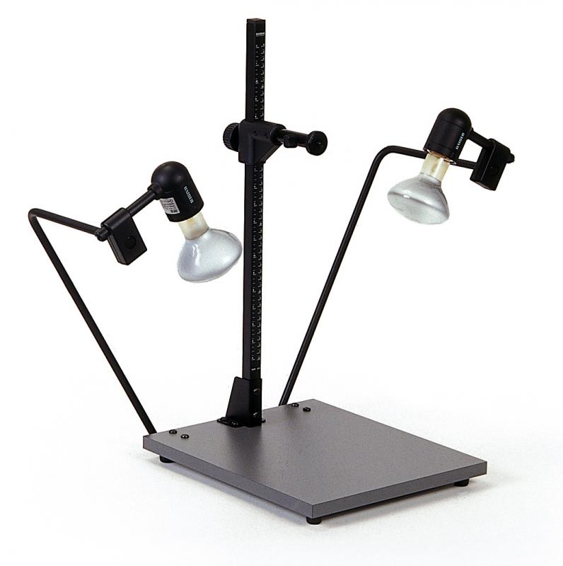 Super kompaktní reprodukční stojan pro malé, lehké fotoaparáty (kompaktní digitální fotoaparáty, CCD kamery atd.).Matná šedá základní deska bez reflexů. Vodicí sloupek s měřítkem v cm a palcích. Výškově nastavitelné rameno kamery. Připojovací závit B 1/4.