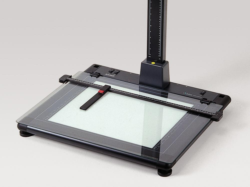 Přítlačná deska z vysoce kvalitního křišťálového skla pro přitlačení vlnitých předloh.Připojeno závěsem ke světelné základní desce a může být zcela zvednuto nebo složeno nahoru.S nastavitelnými zarážkami.
