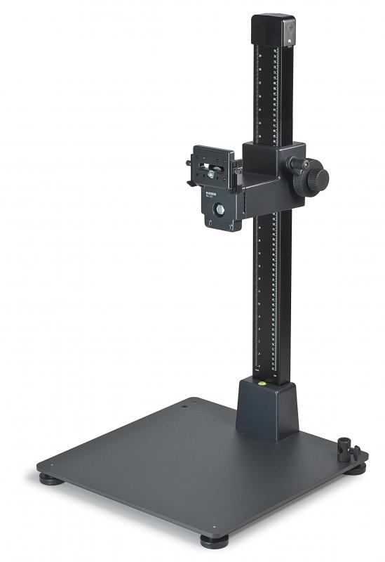 Tmavě šedá ocelová deska s litinovým držákem vodicího sloupku 4407, 4475 nebo jiných sloupků systému R1. Montážní adaptér pro příslušenství se 16 mm standardními kolíky (např. 5965, 5040), namontovatelný vlevo nebo vpravo. Výškově nastavitelné nohy.